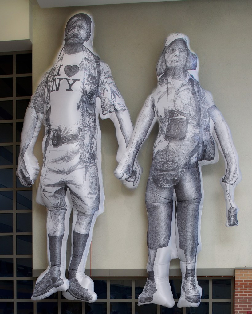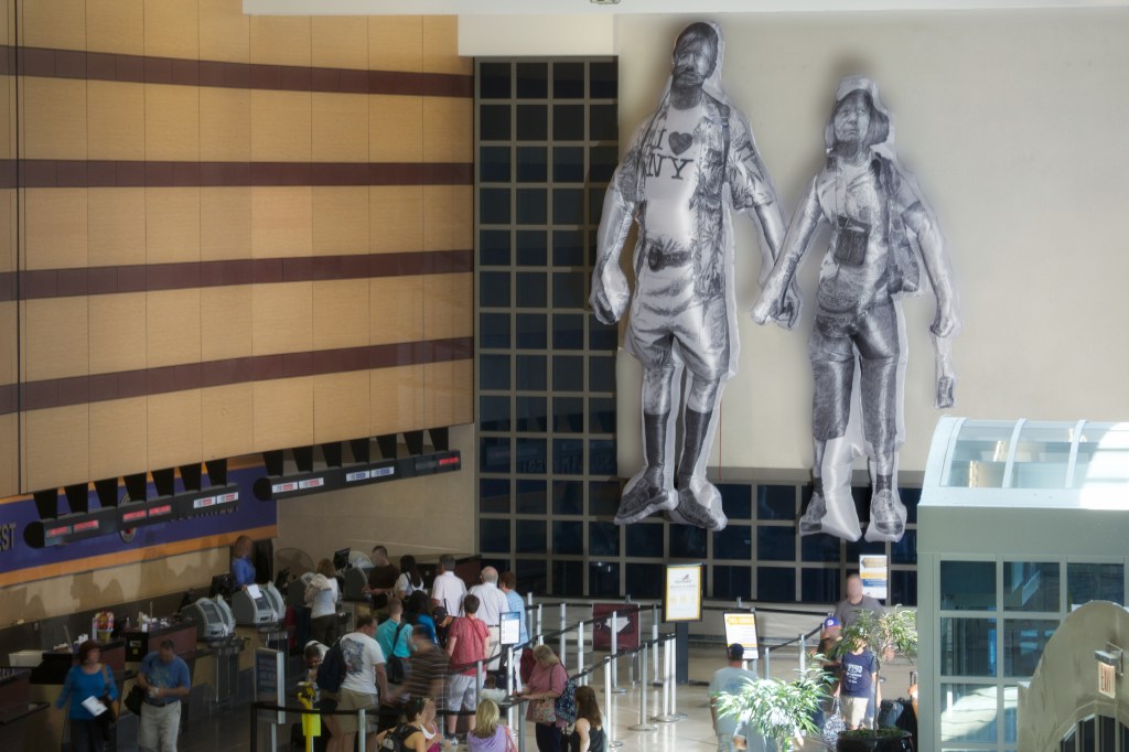 There is a territory in which drawing and sculpture intersect that is fertile ground for many artists. With a keen awareness of art history – and a desire to both honor and parody some of its most hallowed subjects – Benjamin Entner makes renderings of people who echo great works of art. These drawings are then inflated, giving them an imposing three dimensional presence and movement that add character to the individuals and their peculiar situation.