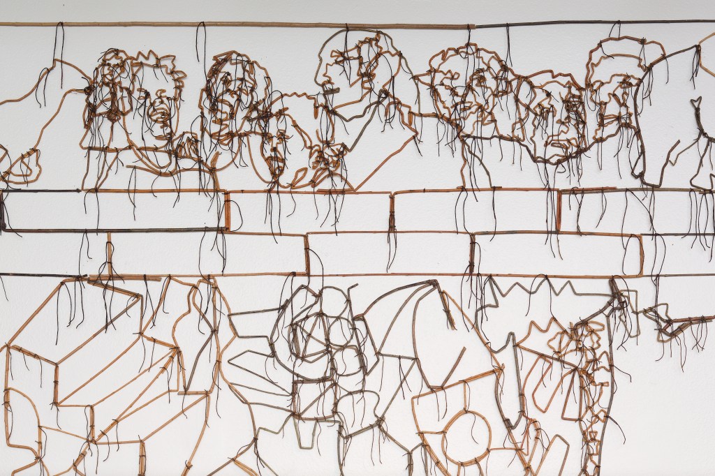 With slim branches of willow, John McQueen describes images of the mind, as well as those of time and place. In the frieze running along the top of Continental Drift, we recognize things from the world, and from history, running together like ideas, or memories. Below, the branches form tightly packed shapes that intermittently suggest familiar objects, but then elude definition.