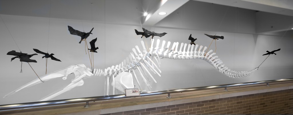 Colin Boyd’s sculptures arise from antiquity and allegory; from our fascination with creatures long extinct and the impulse to preserve, recreate and revive them. In Cormorants and the Whale, Boyd poses a fantastical yet naturalistically rendered scenario of nine cormorants holding aloft the skeleton of a blue whale. While recalling the massive dioramas found in natural history museums, there is also the element of storytelling – what has incited this small flock of living birds to carry the remains of a giant beast? We are left to wonder, speculate and suspend our disbelief, just as the cormorants suspend their cumbersome cargo.