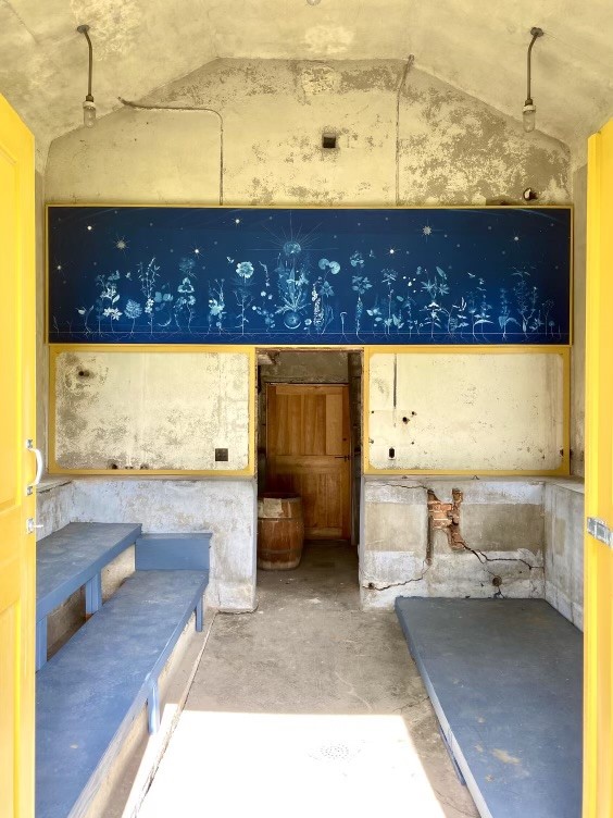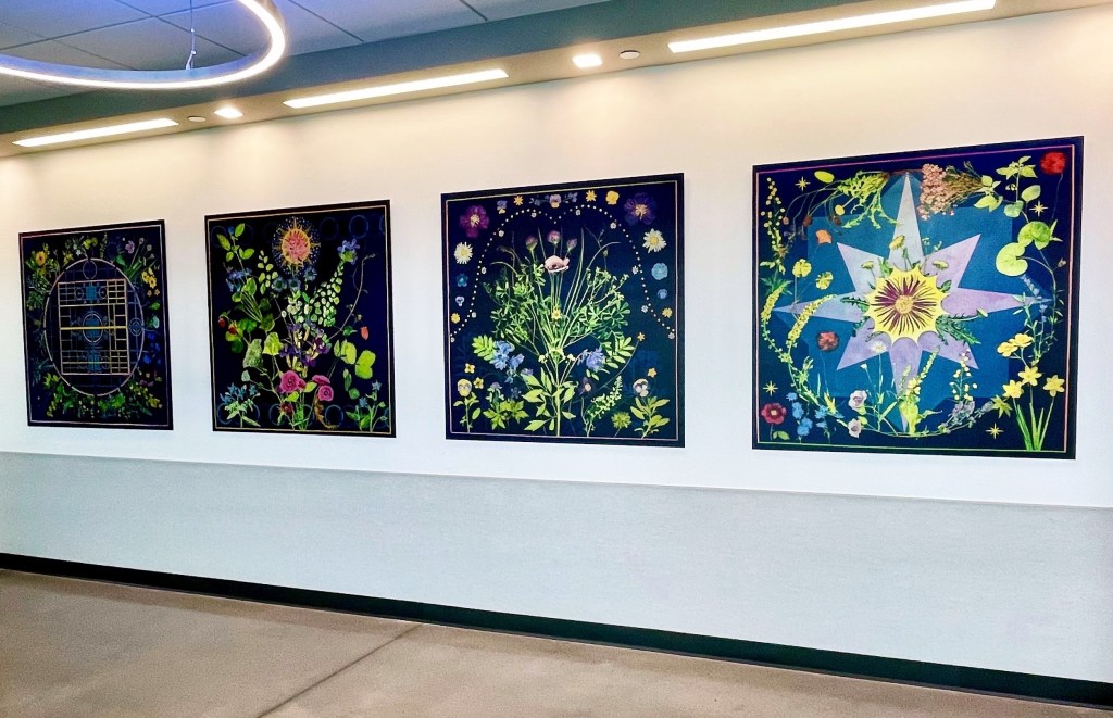 With this collection, the artist produced two site-responsive installations, this one at Albany International Airport and one at the nearby Shaker Heritage Society on the interior and exterior of the historic 1856 Drying House. For the installation at the Albany International Airport, which occupies former Shaker lands, Whitney Barnes developed a series of eight cyanotype paintings on paper with plants collected from the Shaker herb garden. Their compositions were based upon nineteenth-century Shaker ‘gift’ or ‘spirit’ drawings that were complex, divinely inspired revelations of spiritual perfection, often symmetrical and incorporating botanical elements. These eight original paintings were reproduced on aluminum panels and will be sited in the first-floor pedestrian walkway between the south parking garage and main terminal. Planting Utopia will be on view for a minimum of three years.