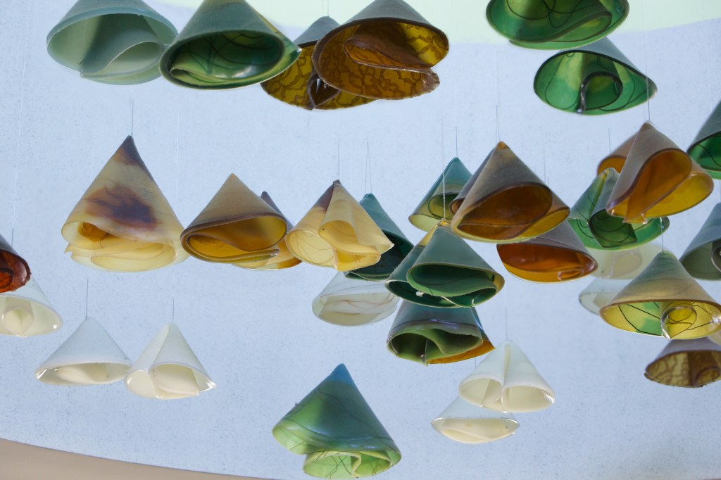 Horizon Formation is composed of thin sheets of cast, pigmented rubber. Their translucency reveals lines of thread and patterns of lace that have been embedded within the forms. With colors echoing the rich tones of soil, sea and sky, these elements fold in upon themselves in gentle curves, much like geographic crests and valleys.
