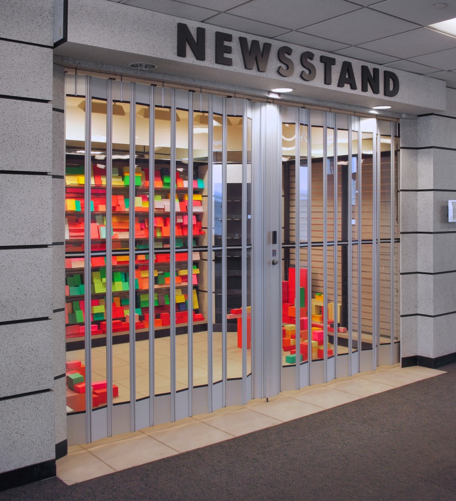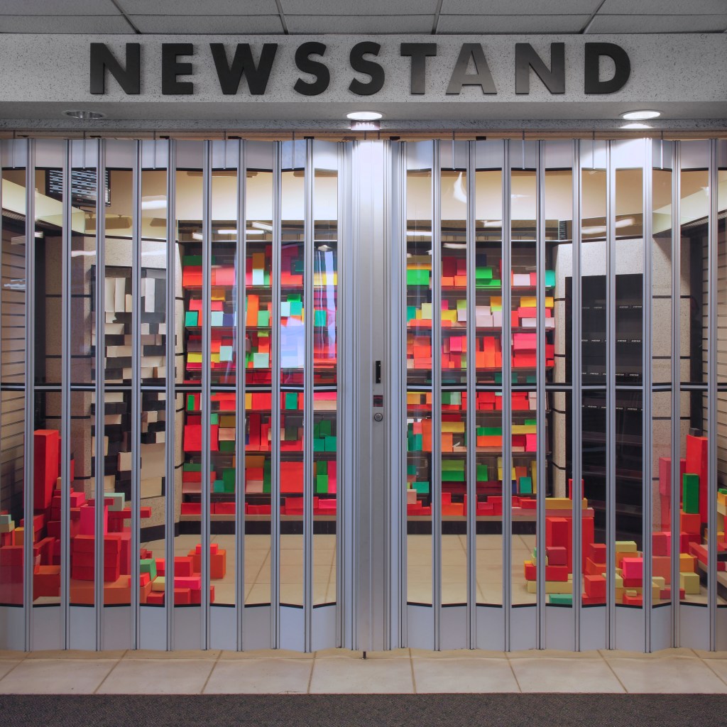 Within the interior of what was until recently a bustling airport newstand, Nancy Shaver and T. Marie have constructed a sculptural environment that playfully recalls the stacks of products and 24 hour news media familiar to travelers.