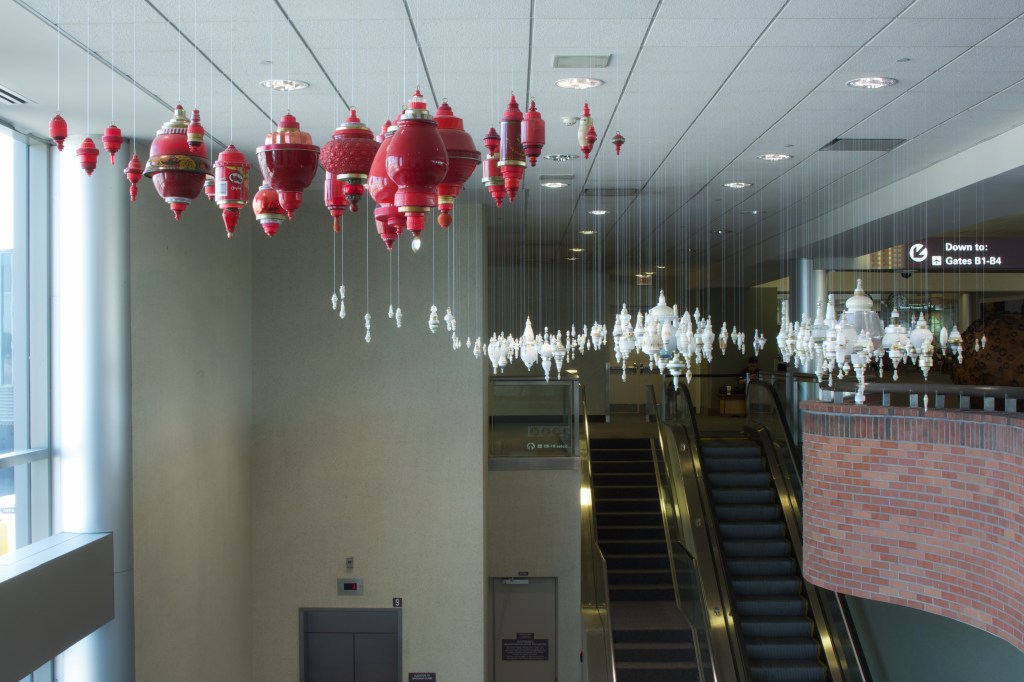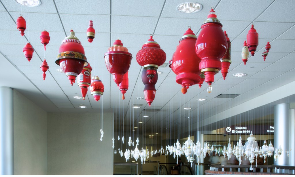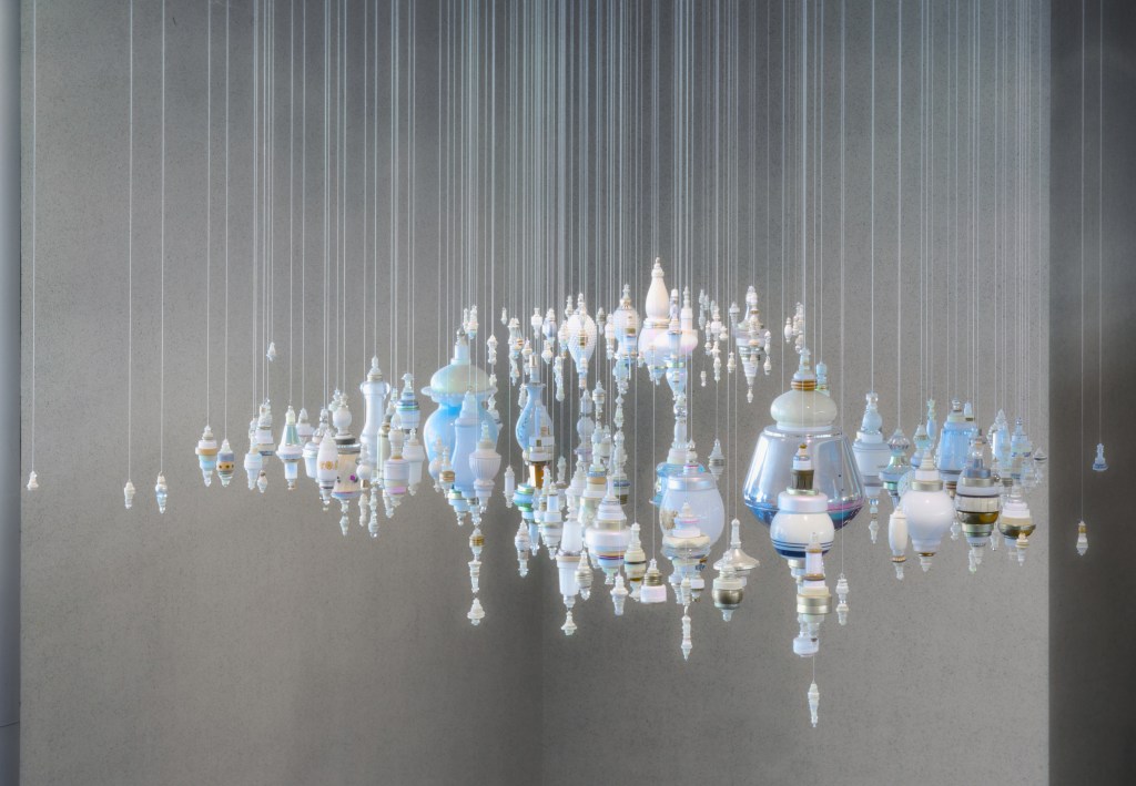 Forms reminiscent of the small, 17th – 19t century carved and turned household objects, collectively known as treen, hover here in a multitude of jewel-like clusters. The individual pieces are assembled from small ornamental and utilitarian objects found in thrift stores, gutters and junk drawers. Bangles, vintage buttons, plastic bottle caps, hobnail lampshades and napkin rings are carefully stacked on top of one another to reveal complex symmetrical configurations. While the individual bits of matter have outlived their intended purposes, they find new life in relationship to one another, together becoming curious treasures suspended in vast multiplicity.